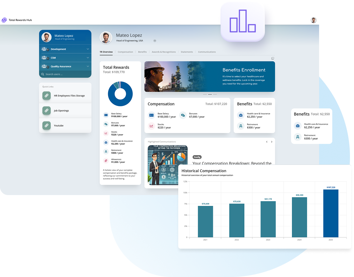 Pay transparency isn’t just about publishing salary ranges, it’s about helping employees understand the full scope of their compensation and benefits. Total Rewards Hub shows base pay, incentives, bonuses, stock, and benefits in one place, creating a transparent and trusted rewards experience.Â