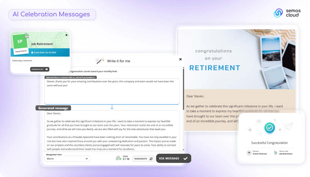 Every organization knows the value of celebrating milestones, gathering timely feedback, and communicating total rewards clearly. Yet celebrations get skipped because people don’t know what to say. Surveys miss the moment because no one can manually track hundreds of dates. And employees with valuable equity compensation and benefits packages have no idea what they’re worth. Behind each of these challenges are manual processes that don’t scale. Our Q3 2025 release addresses this by introducing AI and automation across Recognition & Rewards, Employee Communications, and Total Rewards Hub to make celebrations, feedback, and compensation transparency effortless. Below is a closer look at what we’ve built. Recognition & Rewards: AI Takes the Friction Out of Celebrations Our Recognition & Rewards solution helps organizations build cultures of appreciation through peer-to-peer recognition, manager recognition, and milestone celebrations. This release focuses on the celebrations experience, removing two of the biggest barriers to participation that our customers consistently highlight: not knowing what to say and not knowing when celebrations are happening. Writing the Perfect Celebration Message We’ve all been there: staring at the blank message box, wanting to celebrate a colleague’s 5-year work anniversary but unsure how to express appreciation authentically. Should it be formal? Casual? Personal? The worry about sounding generic or getting the tone wrong is enough to make anyone close the tab and move on. And just like that, the moment passes uncelebrated. It’s a common experience. Many employees want to participate in celebrations but hold back because they don’t feel confident in their writing. “I just didn’t know what to say” is the number one reason people give for not participating in milestone celebrations. AI Celebration Messages eliminates this barrier entirely. Built specifically for milestones like birthdays, work anniversaries, and other “moments that matter,” this new capability generates personalized celebration messages on demand. Unlike recognition messages that require context about specific accomplishments, celebration messages are tied to known events. The system already understands the occasion. Here’s how simple it becomes: an employee navigating to the Celebrations page sees their colleague’s work anniversary. They can either enter a brief message or key points about what they want to express, or let the AI generate something from scratch. Then they click “Write it for me” and select a tone (cheerful, warm, or professional). The system instantly generates a personalized message that feels authentic and appropriate to the relationship and occasion. If they want a different approach, they can regenerate. Otherwise, they send it directly. What previously might have been a skipped celebration becomes a meaningful gesture that takes 30 seconds instead of 30 minutes. Keeping Celebrations Top of Mind Celebrations often go unacknowledged simply because people don’t know when they’re happening. By the time someone realizes their colleague’s work anniversary was this week, it’s too late to contribute. Our new automated celebration reminders solve this. Administrators can now schedule automated email reminders before events occur. They can configure who should be notified (peers, managers, direct reports, division members, or any relevant group) and when they should be reminded (for example, 10 days out, then 3 days before the event). This means no celebration gets forgotten because the right people are reminded at the right time, with enough advance notice to participate. Build a recognition experience that’s consistent, inclusive, and impactful Enhance your recognition program Employee Communications: Automating Feedback at the Right Moments Our Employee Communications solution enables organizations to reach all employees through targeted campaigns, surveys, and the Employee App. This release introduces intelligent survey automation that ties feedback collection to the moments when it matters most. Surveys That Trigger Automatically Based on Employee Lifecycle Events One of the most common frustrations we hear from HR leaders is that they want feedback at key moments (after onboarding, before someone exits, at the 90-day mark) but can’t manually track hundreds of different hire and departure dates. By the time they remember to send a survey, the moment has passed and the feedback is no longer accurate or useful. Our event-based survey creation flow transforms how organizations collect lifecycle feedback by automating survey distribution based on HRIS data. Administrators can now create event-based surveys that automatically trigger when specific employee dates occur, no manual tracking required. Here’s how it works: set up an onboarding survey to automatically send 30 days after an employee’s hire date. Every new employee receives the survey at exactly the right moment, when the onboarding experience is fresh, and the feedback is most valuable. Results flow into aggregated reports where HR can identify patterns and address issues systematically. The same automation works for exit surveys. When a departure date is entered in the HRIS, the survey schedules automatically. This ensures consistent feedback collection during offboarding without HR having to remember to send it manually during the chaos of processing someone’s departure. But it’s not limited to just onboarding and exit. Any HRIS date can serve as a trigger for an automated survey. Want feedback at the 90-day mark? At the one-year anniversary? When someone changes roles? Configure the trigger once, and the system handles the distribution forever. This shift from manual to automated survey distribution means HR spends less time coordinating logistics and more time acting on the insights they gather. Convenient Access to Active Surveys As part of this release, we’ve 